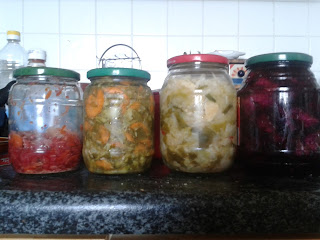 I have regularly noticed that the first time I try something it works out well, and the second time, disaster. I probably get cocky and think that I know best the second time round, I need to learn that this is seldom the case, perhaps after twenty or fifty goes I can start assuming that I know what I am doing. This certainly applied to the rhubarb crumble cake that I made last week to use up the rhubarb pulp and the whey that came from the yoghurt filtering. The first time I made it, it was great. I lined the bottom of the cake dish with the rhubarb and put a whey-sponge on top followed by a crumble topping. This time, the rhubarb (double the amount called for in the recipe without regard for the other ingredients) went in to the sponge (following a complaint from my husband (Dee) that the rhubarb stuck to the serving plate and was messy) In all there was not enough raising agent, and too much batter in this small dish and the whole thing just collapsed in the oven! We have been frying it and eating it as a sweetmeat, not the best. I will perfect this recipe, hopefully it won't take twenty or fifty goes to do so, otherwise my waistline will suffer, perhaps not using rhubarb as rhubarb season is coming to an end. I hope to post the perfected recipe in the future.